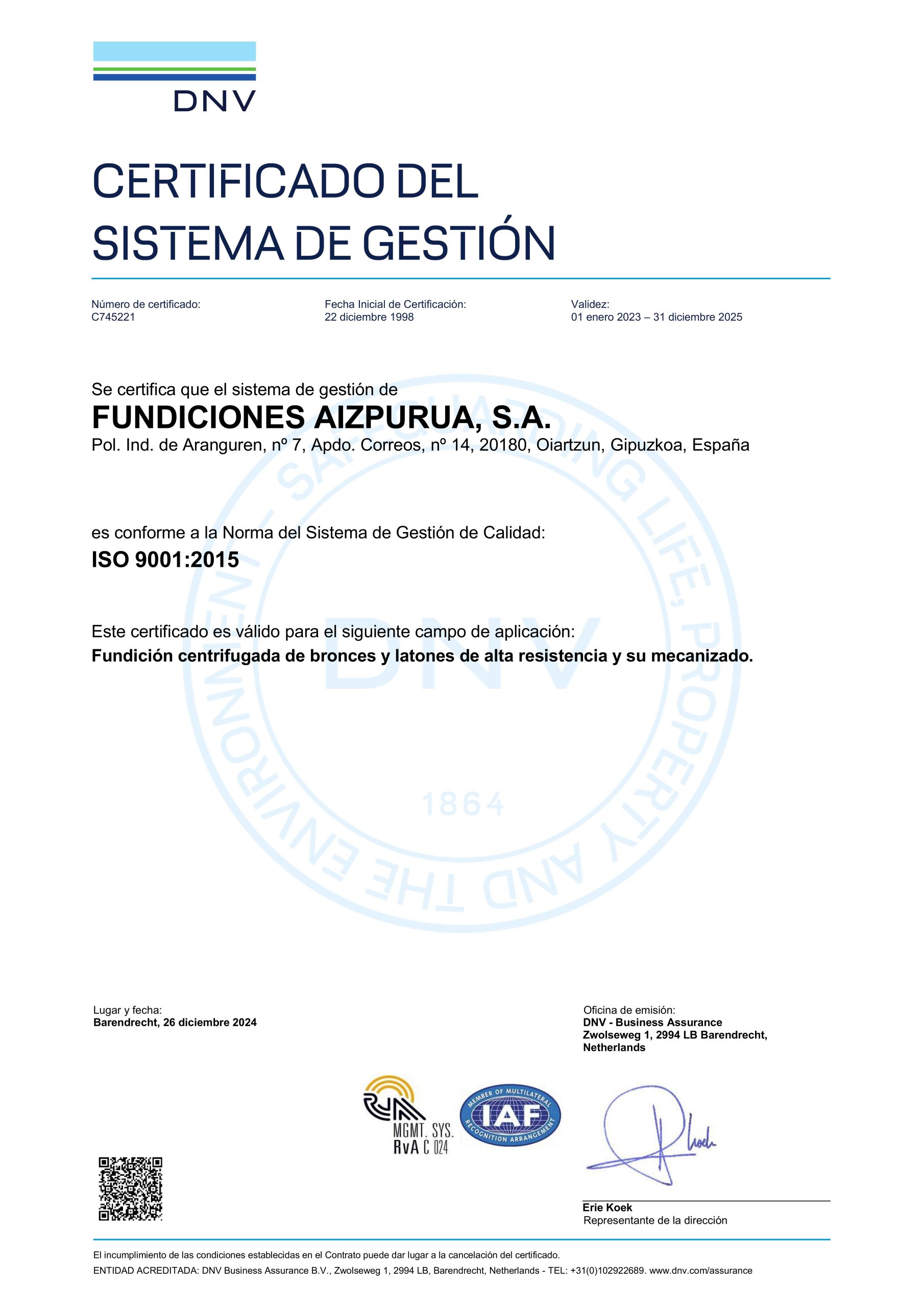 Wir stellen unseren Kunden die Dokumentation der Zertifizierung nach ISO 9001:2015, beglaubigt von DNV – IAF, zur Verfügung. Diese kann sowohl in spanischer als auch in englischer Sprache abgerufen werden. Die Dokumentation wird in einem neuen Fenster des Browsers im JPG-Format eingeblendet.