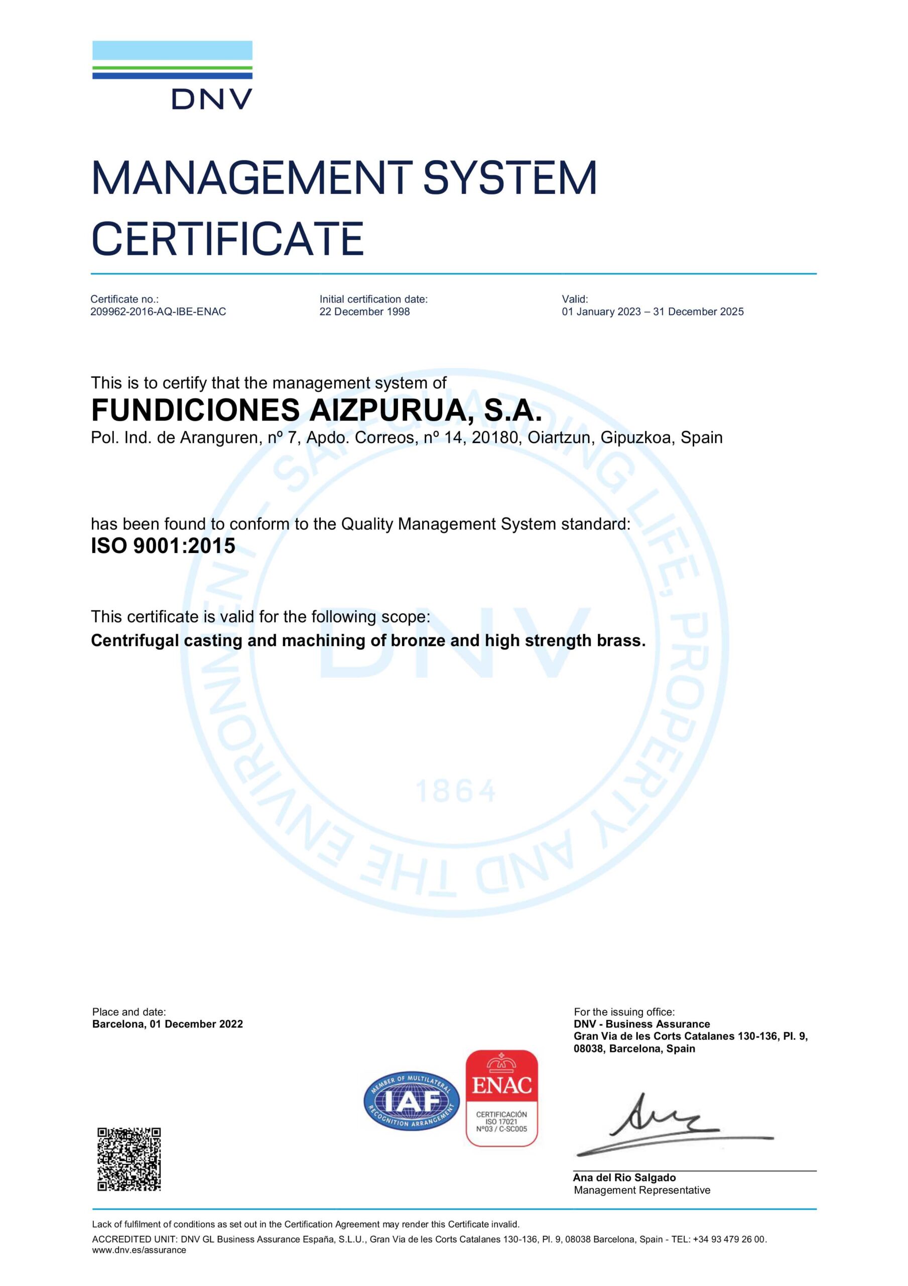 Nos complace anunciar que Fundiciones Aizpurua, S.A. ha conseguido, un año más, el certificado ISO 9001:2015, que avala nuestro sistema de gestión y garantiza su cumplimiento, reafirmando nuestro compromiso con la mejora continua.