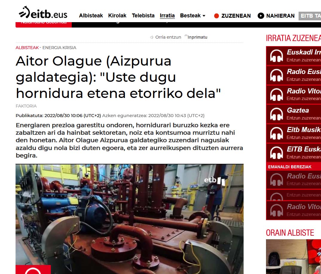 Igor Olague gure Zuzendaria EITBko Faktoria saioan elkarrizketatu dute, egun hauetan dagoen kezkari buruz, energia hornidura eta kontsumo murrizketaz hitz egiteko.